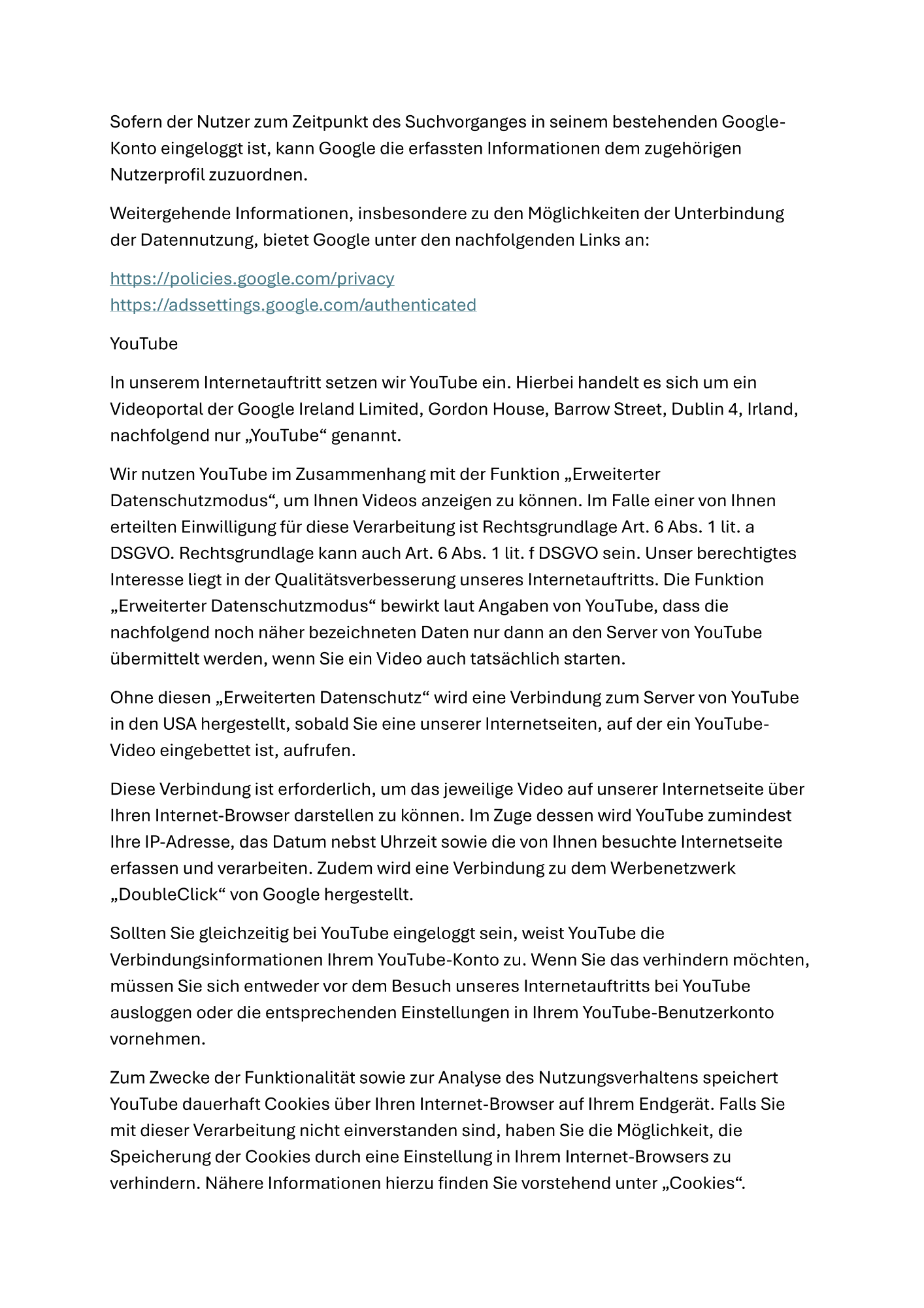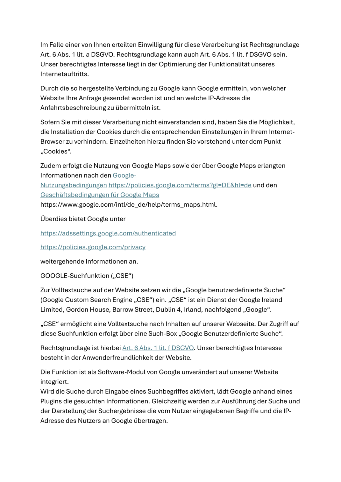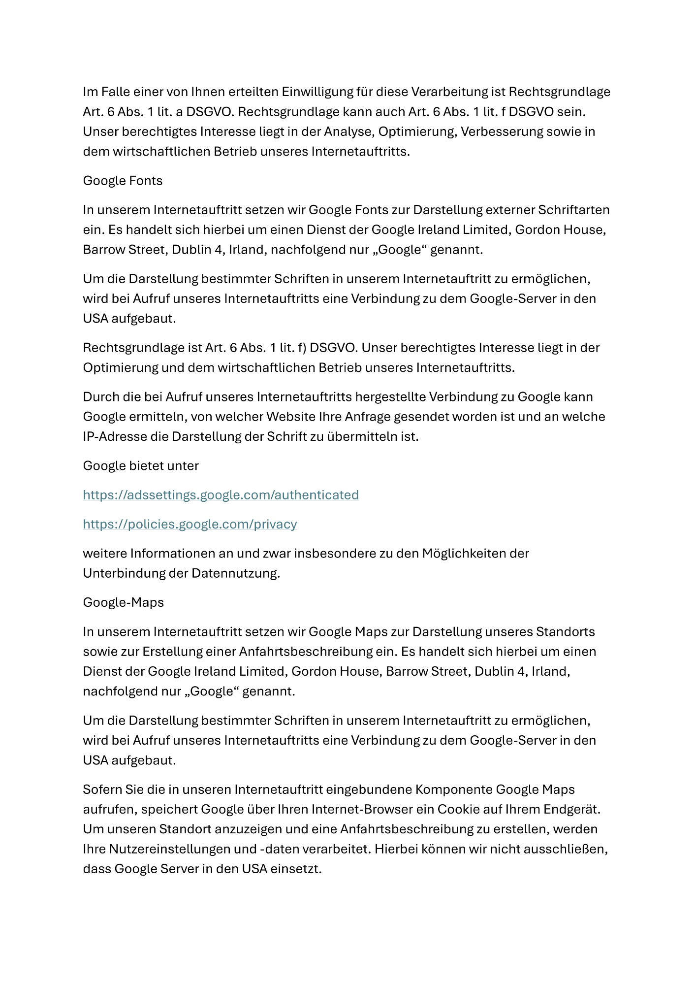 Sofern Sie die in unseren Internetauftritt eingebundene Komponente Google Maps aufrufen, speichert Google über Ihren Internet-Browser ein Cookie auf Ihrem Endgerät. Um unseren Standort anzuzeigen und eine Anfahrtsbeschreibung zu erstellen, werden Ihre Nutzereinstellungen und -daten verarbeitet. Hierbei können wir nicht ausschließen, dass Google Server in den USA einsetzt.