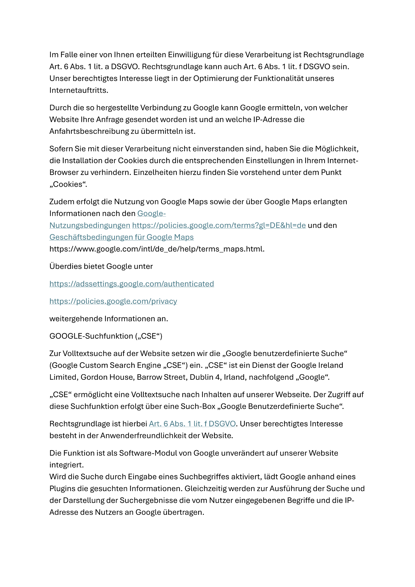 Zudem erfolgt die Nutzung von Google Maps sowie der über Google Maps erlangten Informationen nach den Google-Nutzungsbedingungen https://policies.google.com/terms?gl=DE&hl=de und den Geschäftsbedingungen für Google Maps https://www.google.com/intl/de_de/help/terms_maps.html.