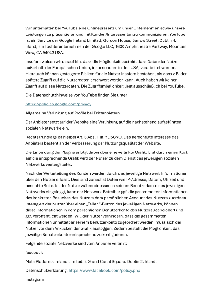Insofern weisen wir darauf hin, dass die Möglichkeit besteht, dass Daten der Nutzer außerhalb der Europäischen Union, insbesondere in den USA, verarbeitet werden. Hierdurch können gesteigerte Risiken für die Nutzer insofern bestehen, als dass z.B. der spätere Zugriff auf die Nutzerdaten erschwert werden kann. Auch haben wir keinen Zugriff auf diese Nutzerdaten. Die Zugriffsmöglichkeit liegt ausschließlich bei YouTube.