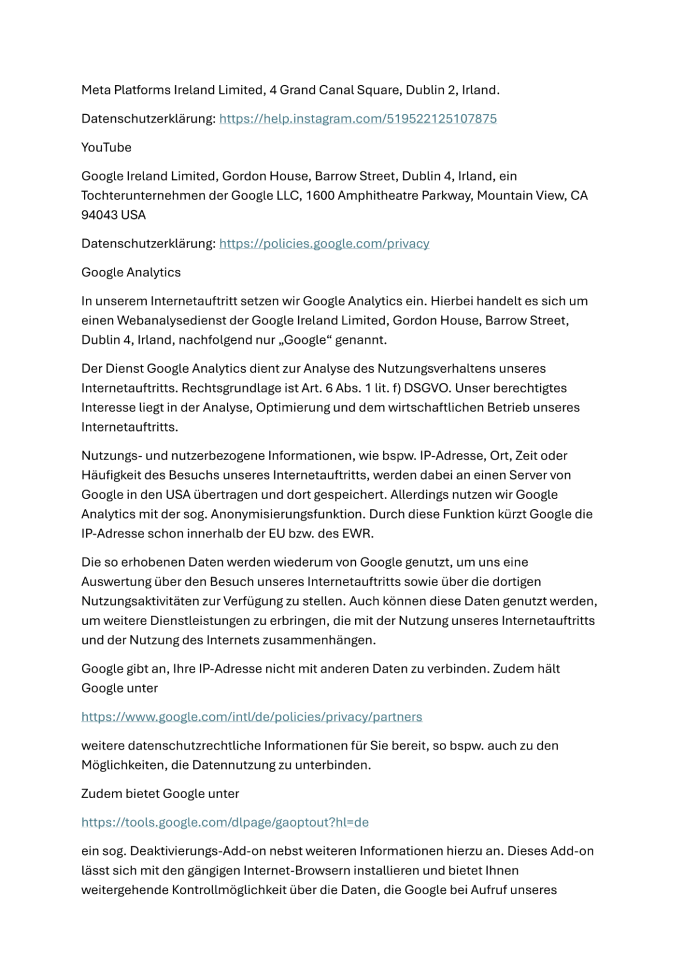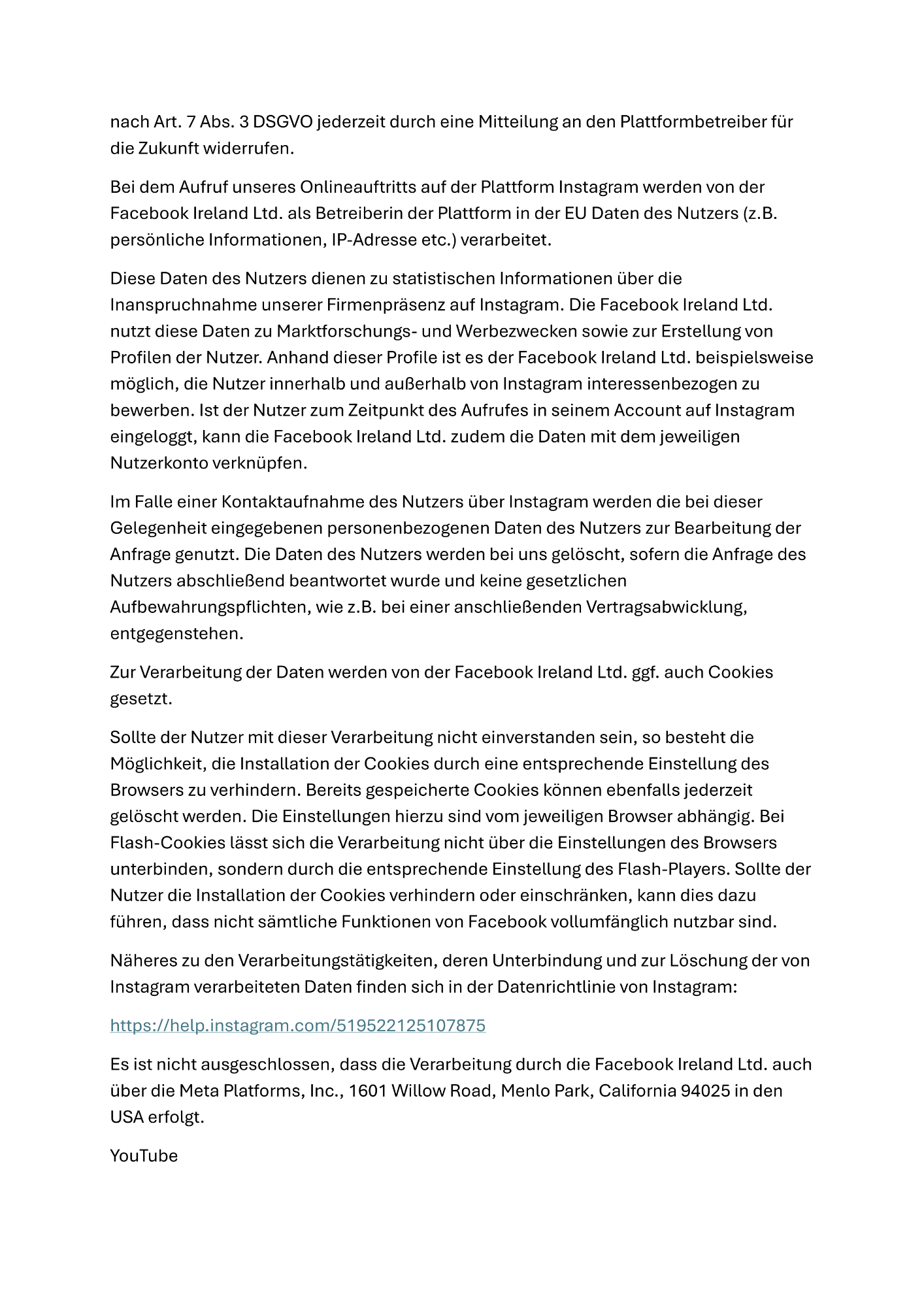 Bei dem Aufruf unseres Onlineauftritts auf der Plattform Instagram werden von der Facebook Ireland Ltd. als Betreiberin der Plattform in der EU Daten des Nutzers (z.B. persönliche Informationen, IP-Adresse etc.) verarbeitet.