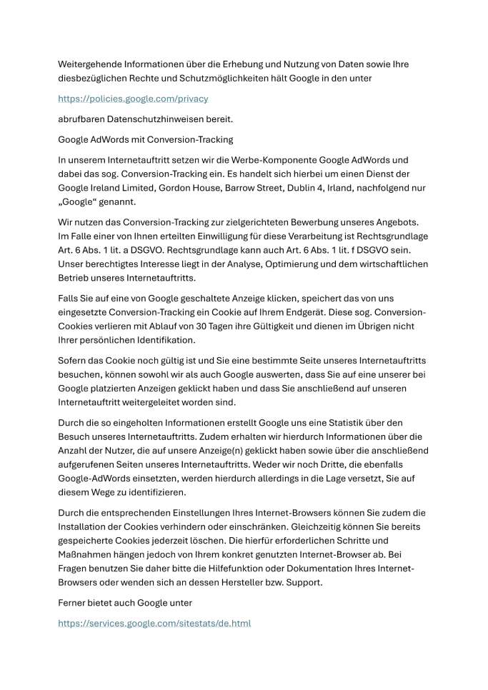 Weitergehende Informationen, insbesondere zu den Möglichkeiten der Unterbindung der Datennutzung, bietet Google unter den nachfolgenden Links an: