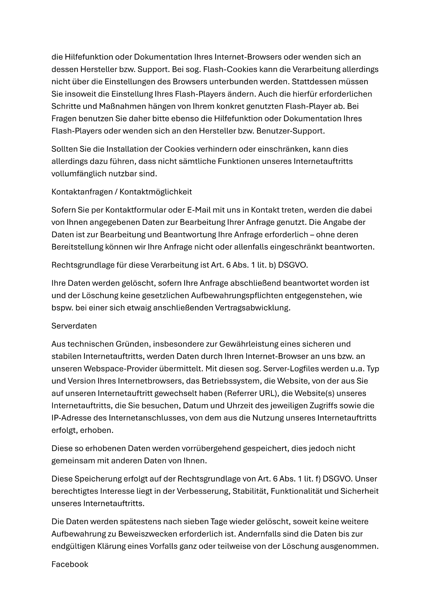 Im Falle einer Kontaktaufnahme des Nutzers über Facebook werden die bei dieser Gelegenheit eingegebenen personenbezogenen Daten des Nutzers zur Bearbeitung der Anfrage genutzt. Die Daten des Nutzers werden bei uns gelöscht, sofern die Anfrage des Nutzers abschließend beantwortet wurde und keine gesetzlichen Aufbewahrungspflichten, wie z.B. bei einer anschließenden Vertragsabwicklung, entgegenstehen.