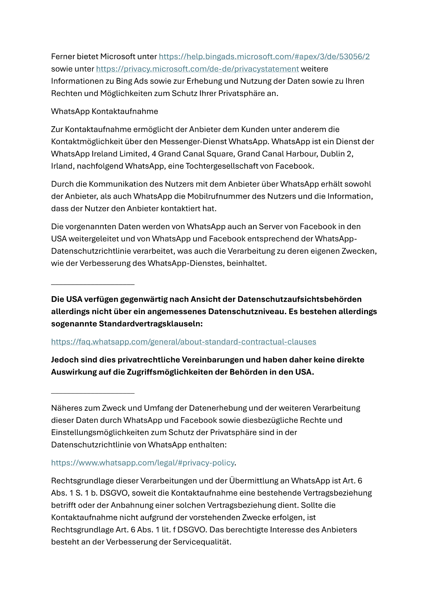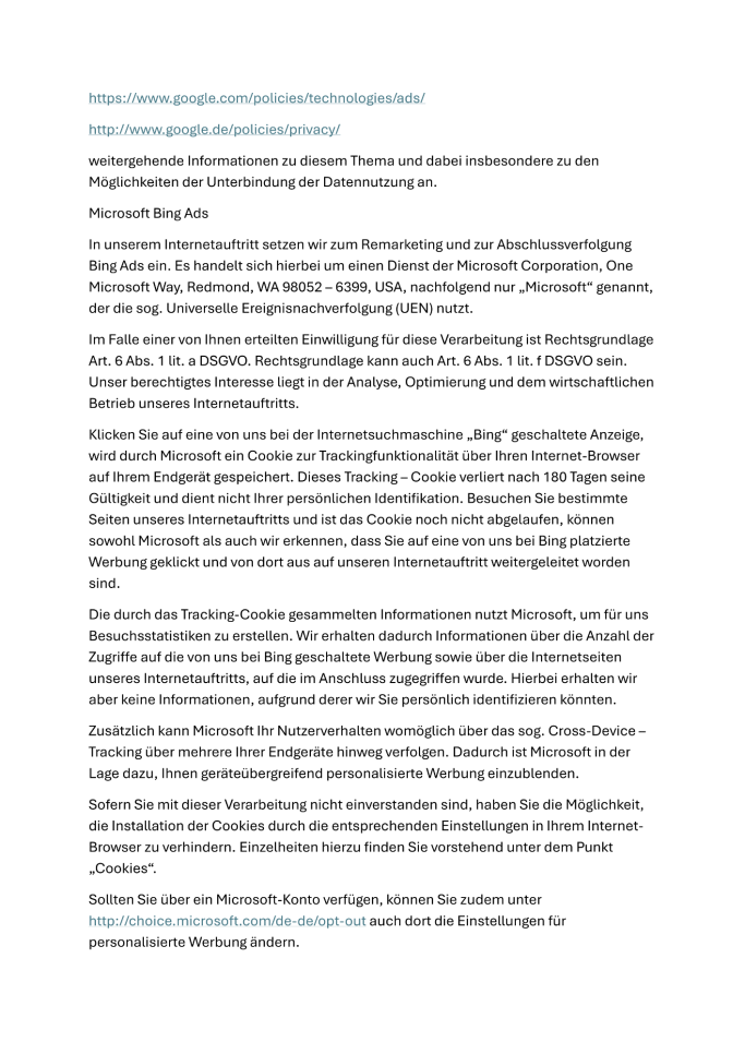 Ferner bietet Microsoft unter https://help.bingads.microsoft.com/#apex/3/de/53056/2 sowie unter https://privacy.microsoft.com/de-de/privacystatement weitere Informationen zu Bing Ads sowie zur Erhebung und Nutzung der Daten sowie zu Ihren Rechten und Möglichkeiten zum Schutz Ihrer Privatsphäre an.