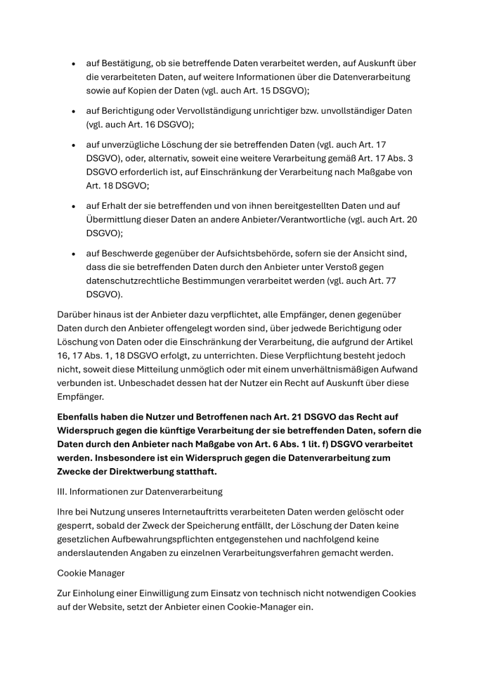 Ebenfalls haben die Nutzer und Betroffenen nach Art. 21 DSGVO das Recht auf Widerspruch gegen die künftige Verarbeitung der sie betreffenden Daten, sofern die Daten durch den Anbieter nach Maßgabe von Art. 6 Abs. 1 lit. f) DSGVO verarbeitet werden. Insbesondere ist ein Widerspruch gegen die Datenverarbeitung zum Zwecke der Direktwerbung statthaft.