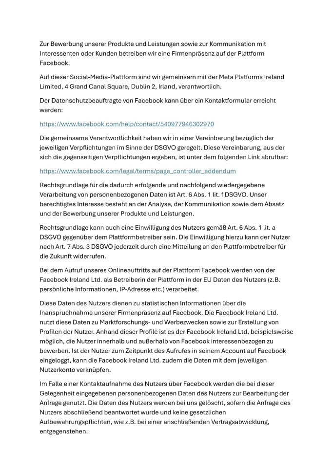Zur Bewerbung unserer Produkte und Leistungen sowie zur Kommunikation mit Interessenten oder Kunden betreiben wir eine Firmenpräsenz auf der Plattform Facebook.